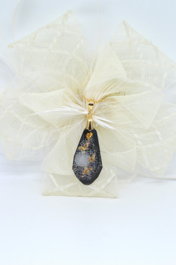 Une perle de lait de 6mm enfermée dans un pendentif de couleur noir agrémenté de feuille d’or et paillettes irisées.