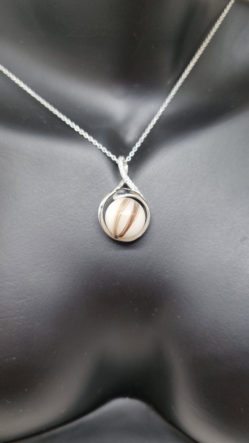 Vous aimez la couleur blanche mais n’allaitez pas ou plus? Je peux également vous le proposer avec un colorant blanc légèrement irisé afin de faire ressortir la mèche de cheveux. (N’ayant pas de photo du pendentif avec le colorant, vous verrez le rendu sur la photo du bracelet et perle jointe à la fiche produit afin de vous faire une idée)